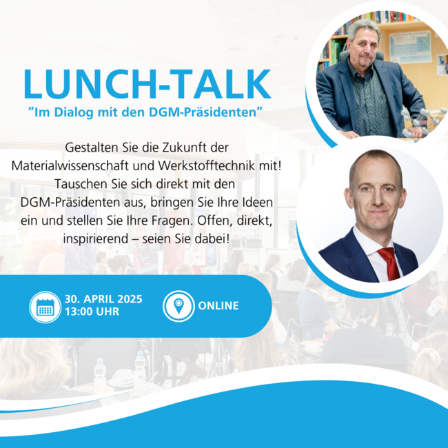 Die Materialwissenschaft und Werkstofftechnik stehen vor großen Herausforderungen und Chancen. Beim kommenden Lunch-Talk können Sie aktiv mitgestalten und Ihre Perspektiven einbringen. Diskutieren Sie mit den Präsidenten unter anderem folgende Fragen: