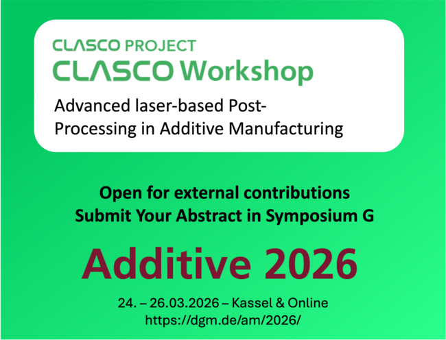 The CLASCO Project will hold its final workshop at the 5th Symposium on Materials and Additive Manufacturing – Additive 2026, taking place from 24 to 26 March 2026 in Kassel, Germany, and online. As part of the conference programme, CLASCO will organise Symposium G, dedicated to advanced laser-based post-processing in additive manufacturing.