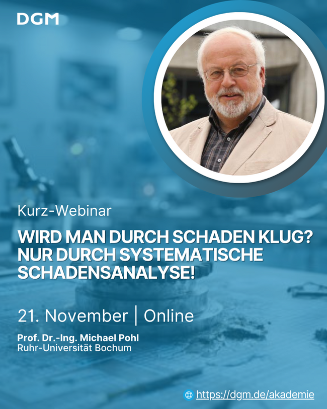 Das Kurzwebinar knüpft an die langjährige Tradition der DGM-Seminare in Ermatingen an, die sich durch den wissenschaftlich fundierten und zugleich praxisorientierten Ansatz in der Schadensanalyse einen ausgezeichneten Ruf erworben haben.