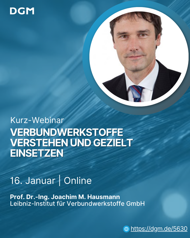Unter der Leitung von Prof. Dr.-Ing. Joachim M. Hausmann vom Leibniz-Institut für Verbundwerkstoffe GmbH vermittelt das kostenfreie Webinar „Verbundwerkstoffe verstehen und gezielt einsetzen“ in nur einer Stunde das essenzielle Wissen, um Verbundwerkstoffe richtig einzuordnen und sicher anzuwenden. Teilnehmende lernen,