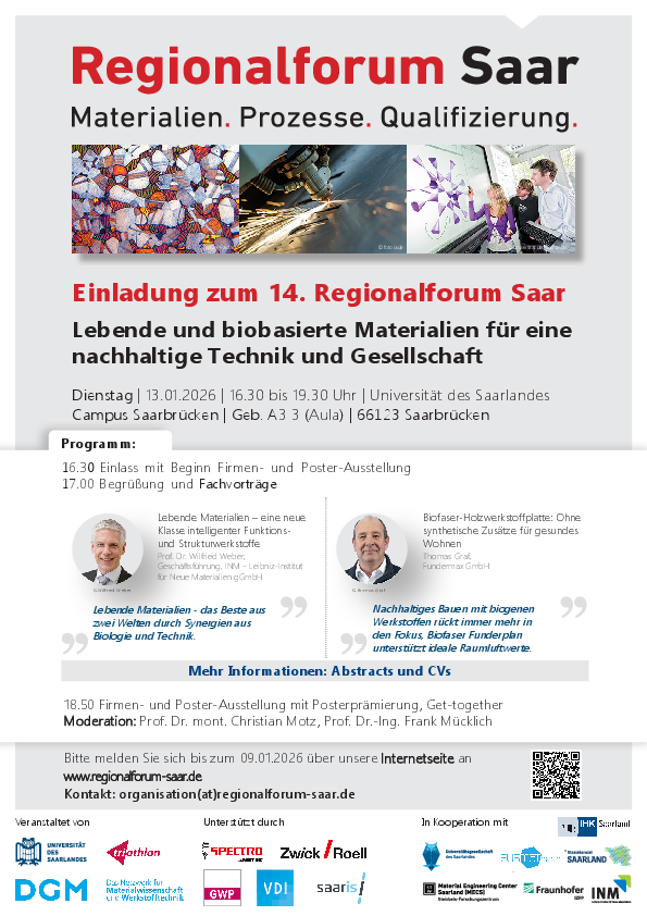 The event starts at 4.30 p.m. Continuing at 6:50 p.m., the combined company and poster exhibition will conclude the event and provide an open opportunity for in-depth discussions. The forum will be moderated by Prof. Dr. mont. Christian Motz and Prof. Dr.-Ing. Frank Mücklich.