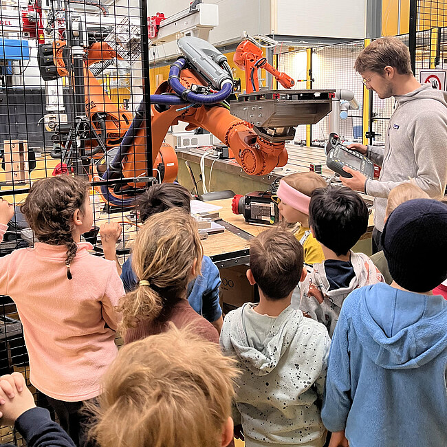 Der zweite Tag (13. April 2023) des Projekts führte die Kinder in das Advanced Manufacturing Lab der ETH Zürich. Dort hatten sie die Gelegenheit, das Mikroskopielabor, den Roboterzoo und das 3D-Drucklabor zu erkunden. Bei den Experimenten konnten sie ihre Milchzähne unter dem Mikroskop betrachten und lernen, wie man Roboter steuert, um damit Schokobonbons in einen Korb zu sammeln. Als Highlight bekamen sie sogar 3D-gedruckte Osterhasen geschenkt.